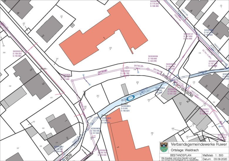 Die Bestandsdaten unserer Trinkwasser- und Kanalnetze werden von uns nach Möglichkeit auf dem aktuellen Stand gehalten. Trotz großer Sorgfalt können wir die plangenaue Lage der jeweiligen Leitung nicht garantieren. Alle Angaben in den Planaus-zügen sind daher ohne Gewähr und ggf. (nach Möglichkeit) vor Ort auf Korrektheit zu überprüfen.